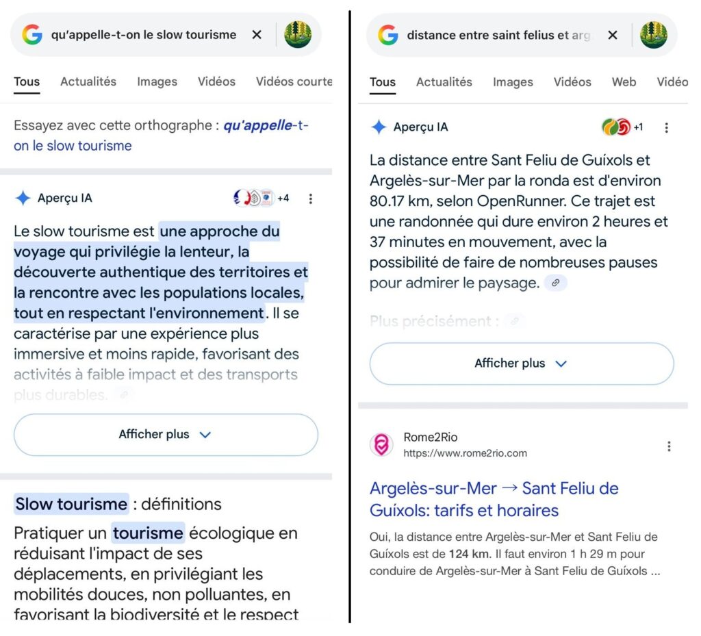 Lors d’un séjour en Espagne, j’ai pu tester la fonctionnalité. A la question générique « qu’appelle-t-on le slow tourisme », Google a poussé en tête des réponses un « aperçu IA » qui correspondait à la synthèse de ses recherches sur des sites qu’ils jugeaient pertinents sur le sujet (voire ci-dessous). Idem sur la deuxième question, plus spécifique « Quelle est la distance entre Sant Feliu de Guixols et Argelès-sur-Mer par la ronda ». La première réponse est satisfaisante, la deuxième nettement moins puisque la « ronde » est totalement pédestre… Je vous laisse les apprécier.