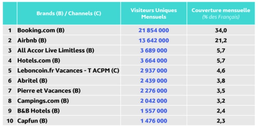 Le leader de la réservation hôtelière Booking.com arrive largement en tête avec 34% de couverture mensuelle, devant Airbnb (21%). Loin derrière les deux plateformes, suivent Accor et Hotels.com (près de 6% chacun).