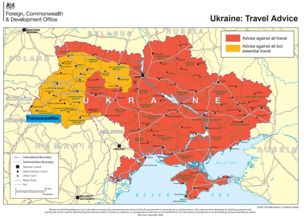 La Transcarpathie est déjà classée en orange par le Foreign Office (au Royaume-Uni, NDLR), qui déploie les mêmes codes couleurs que la France.