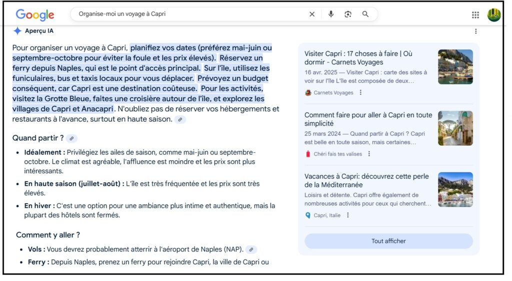 Google, justement, tente clairement de rattraper son retard à l’allumage dans l’IA. « Gemini est actuellement en tête sur l’AppStore, devant ChatGPT, s’est réjoui Charles-Antoine Duron, le directeur tourisme et mobilité de Google France, et membre du CTT. Le géant américain pimente aussi son moteur de recherche avec IA Overviews (aperçus IA), une fonctionnalité déployée presque partout dans le monde, mais pas encore en France (voir la capture d’écran ci-dessous). Son « mode IA », lui, actif aux Etats-Unis et au Royaume-Uni, est un onglet qui permet d’avoir une conversation comme dans ChatGPT.